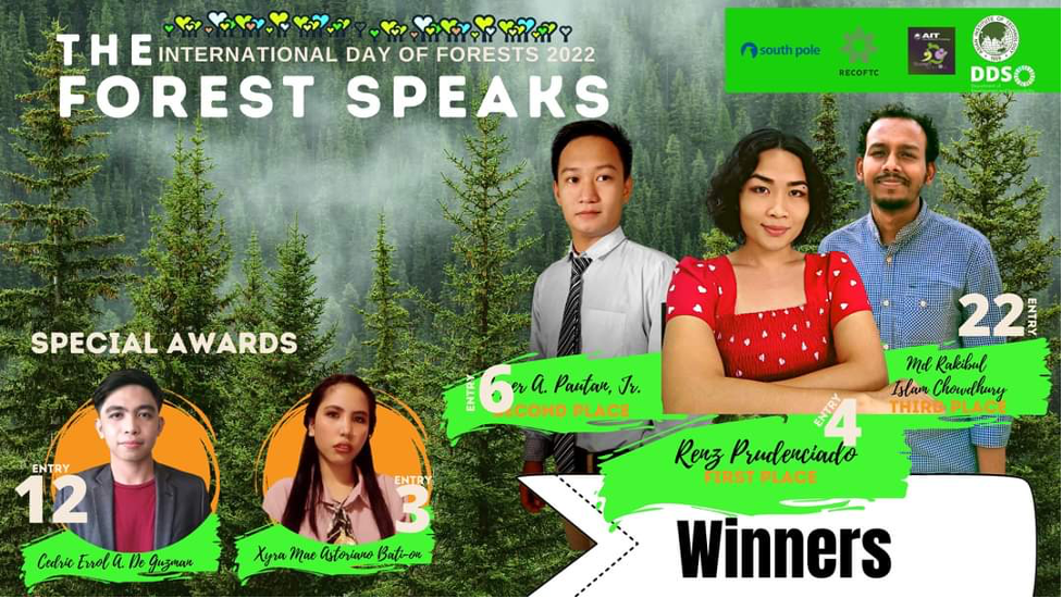 In “The Forest Speaks” poetry contest, the winning poems are: first place winner: “A Whisper of a Dying Heart”, second place: “When Forest Speaks, Hear, It Seeks”, third place: “Disloyal”, special awards: “Song of Nature for Our future” and “Hear Her Voice”.