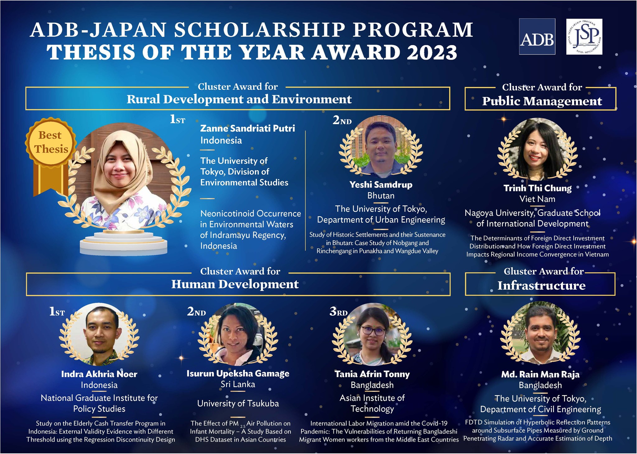 Expressing her immense joy upon receiving the award, Tania shares, “Receiving this award is undeniably one of the most significant milestones in my life, and I am deeply grateful to my supervisor, Prof. Kyoko Kusakabe, my committee members, the GDS family, ADB-JSP, and the evaluation committee for their unwavering support and recognition.”