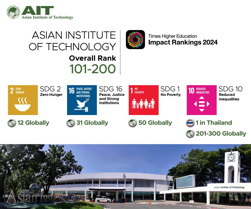 The overall ranking considers universities’ performance in their top three individual SDG categories and the mandatory category of SDG 17—Partnerships for the Goals. AIT participated in 12 out of the 17 SDGs.