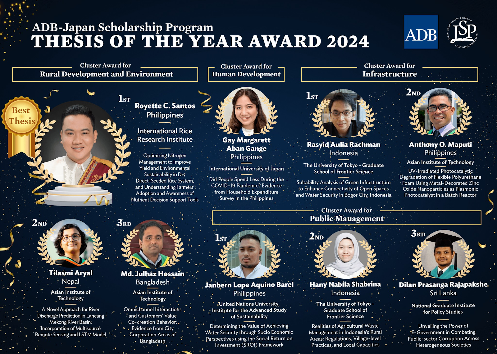 3 June 2024: Three recent AIT graduates, Anthony O. Maputi, Tilasmi Aryal, and Md. Julhaz Hossain won the prestigious ADB-JSP Thesis of the Year Award 2024. They secured second and third place under the Cluster of Rural Development and Environment and second place under the Cluster for Infrastructure.