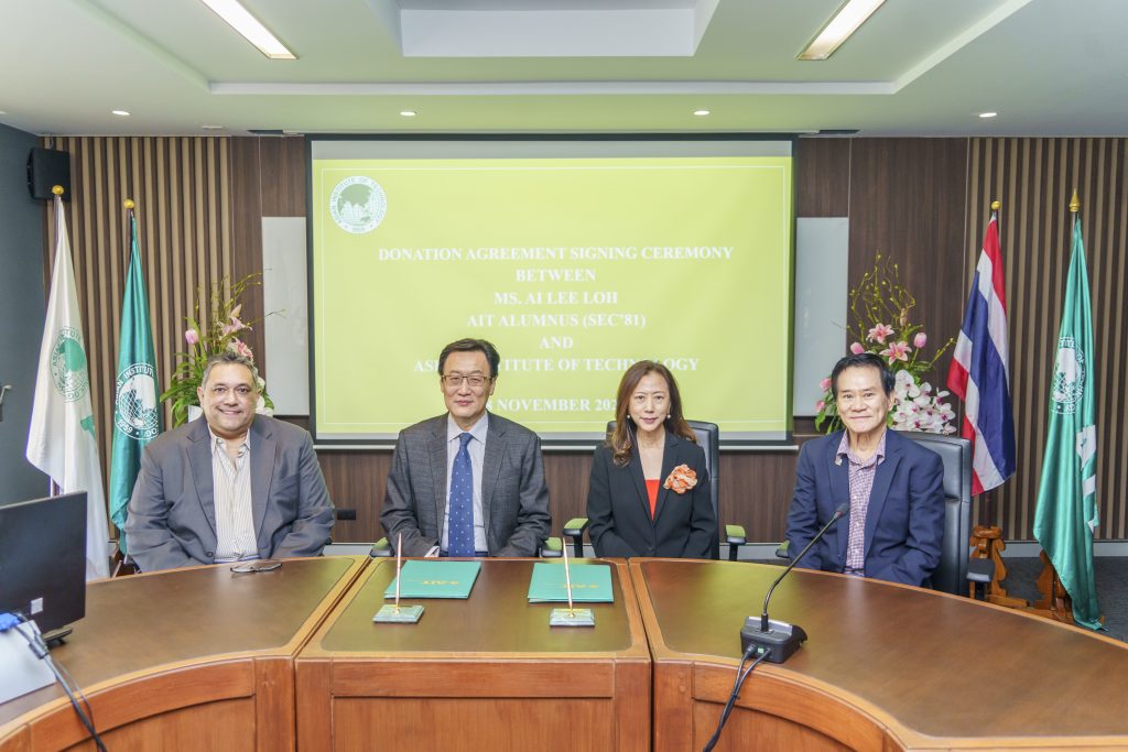 On November 28, 2024, a formal donation agreement was signed between AIT President Prof. Pai-Chi Li and Ms. Ai Lee Loh, an AIT alumni who graduated with a Master’s degree in Structural Engineering and Construction in 1981, who contributed THB 200,000 towards the refurbishment of a single-unit student dormitory in Dorm F48. The donation signing ceremony was attended by Emeritus Prof. Worsak Kanok-Nukulchai (former AIT President). This signing ceremony underscores AIT’s ongoing efforts to improve students’ living environments, ensuring they have a comfortable and conducive space to focus on their academic pursuits.