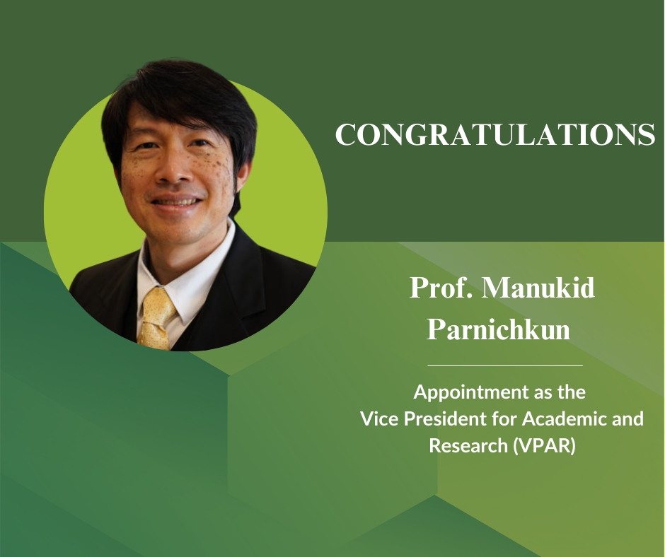 1 March 2025: Prof. Manukid Parnichkun has been appointed as the Vice President for Academic and Research (VPAR), effective 1 March 2025.
