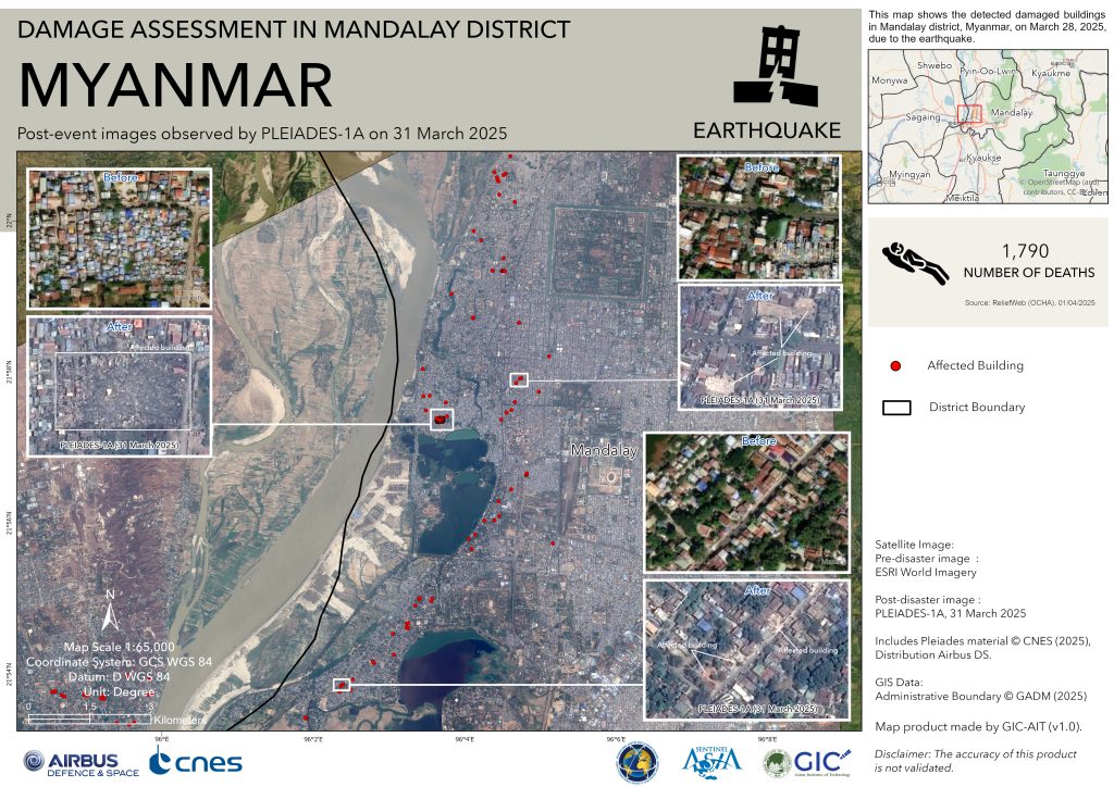 In the immediate aftermath of the earthquake, AIT’s Geoinformatics Center (GIC) produced a series of satellite-based post-disaster maps for the most severely affected areas, including the Sagaing and Kyaukse districts in Myanmar. For the impact assessment, GIC utilized pre-disaster imagery from ESRI World Imagery (approx. 30 cm resolution)and post-disaster imagery from Airbus’s PLEIADES-1A satellite (50 cm resolution) to analyze the extent and distribution of the damage.