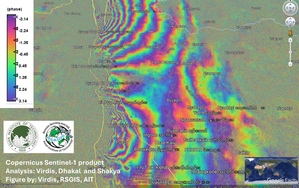 Students from AIT’s Remote Sensing and Geographic Information Systems (RSGIS) program conducted a satellite-based damage analysis to map fault activity and assess structural impact. Using Sentinel-1 SAR and Sentinel-2 MSI imagery, they identified over 2 meters of horizontal displacement along a 500-kilometer rupture of the Sagaing Fault, along with 25 cm of vertical movement using InSAR.