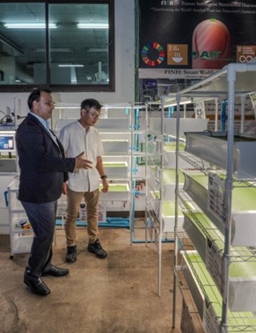 Professor Anil Kumar Anal and PhD scholar Mr. Prasit Pongsoon with the FINH Smart Wolffia Farming System installed at the FIBNH Lab, Biotechnology Building, Asian Institute of Technology (AIT).