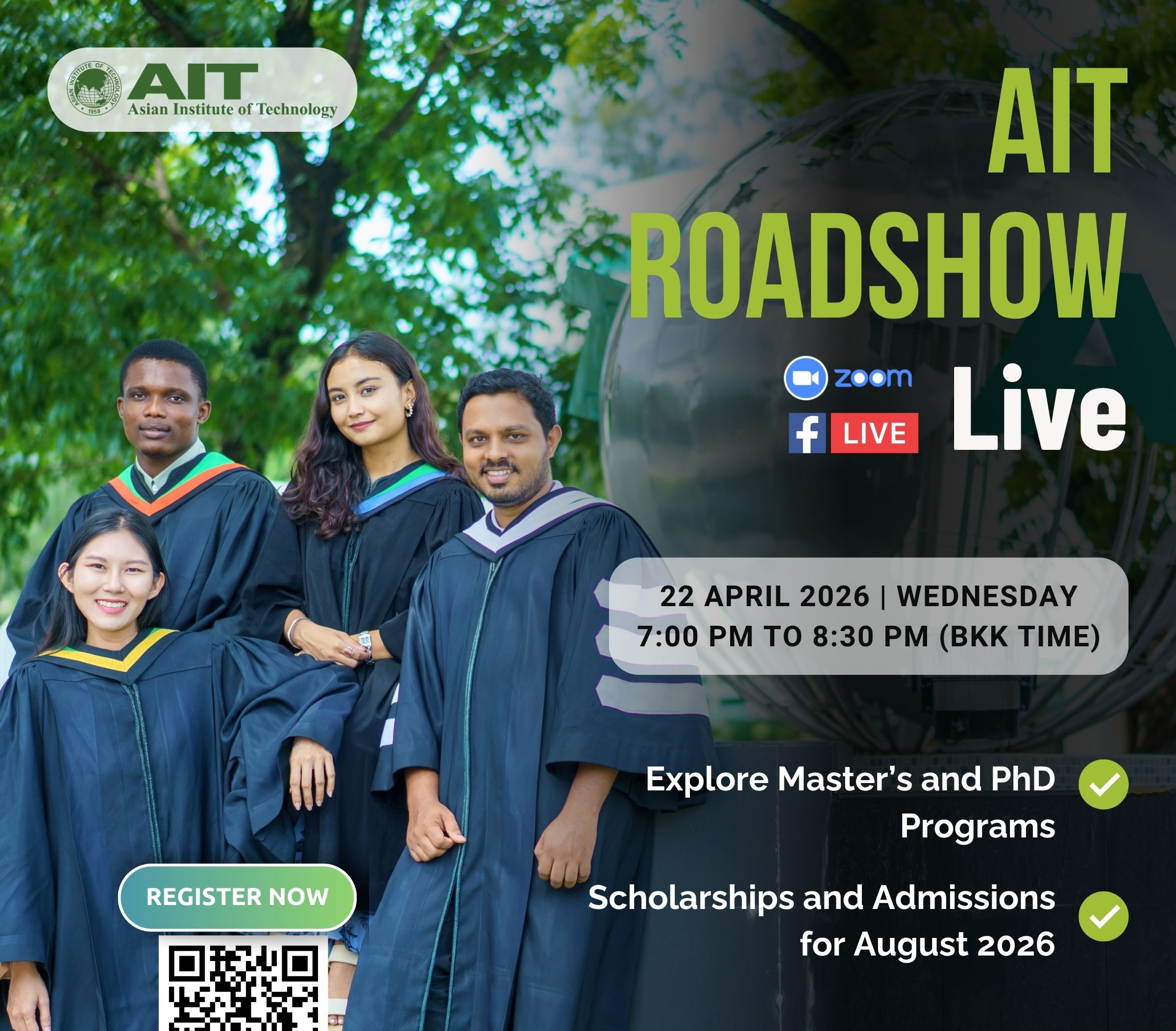Thinking about pursuing your Master’s or PhD at AIT? Join our online roadshow to explore academic programs, scholarships, admissions, and student life directly with our deans, faculty, students, and admissions team.